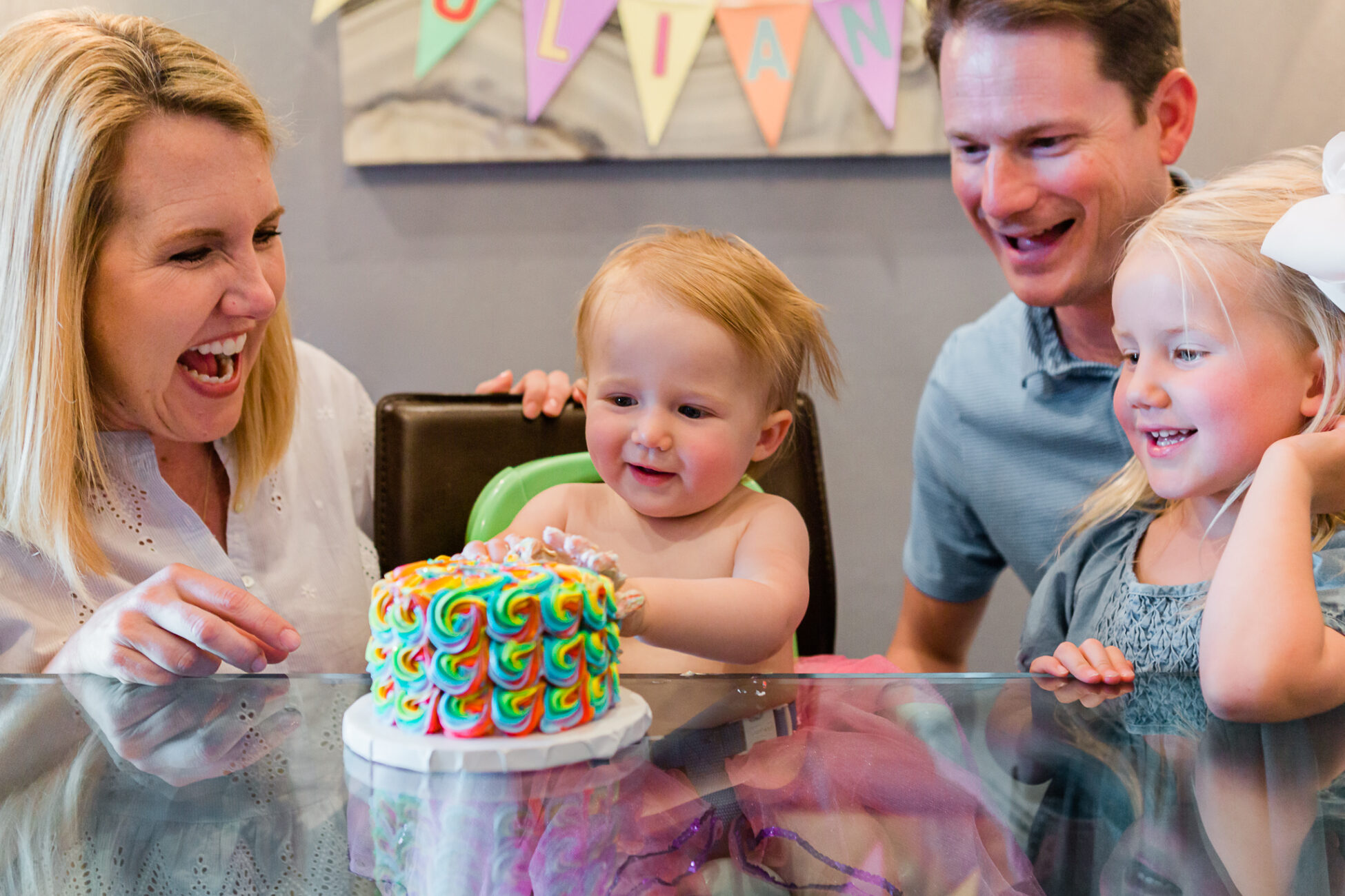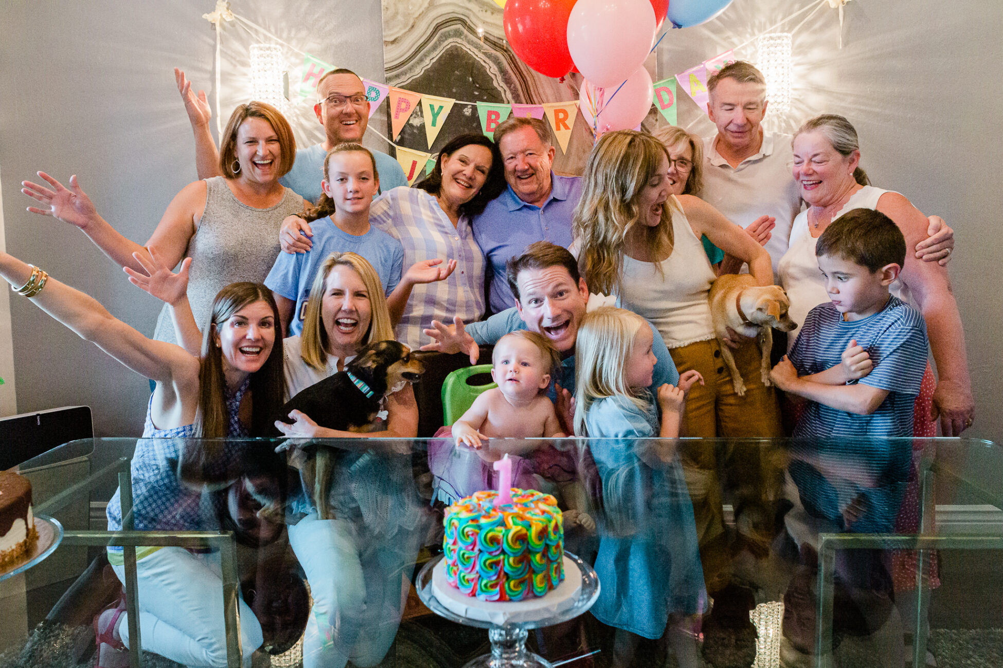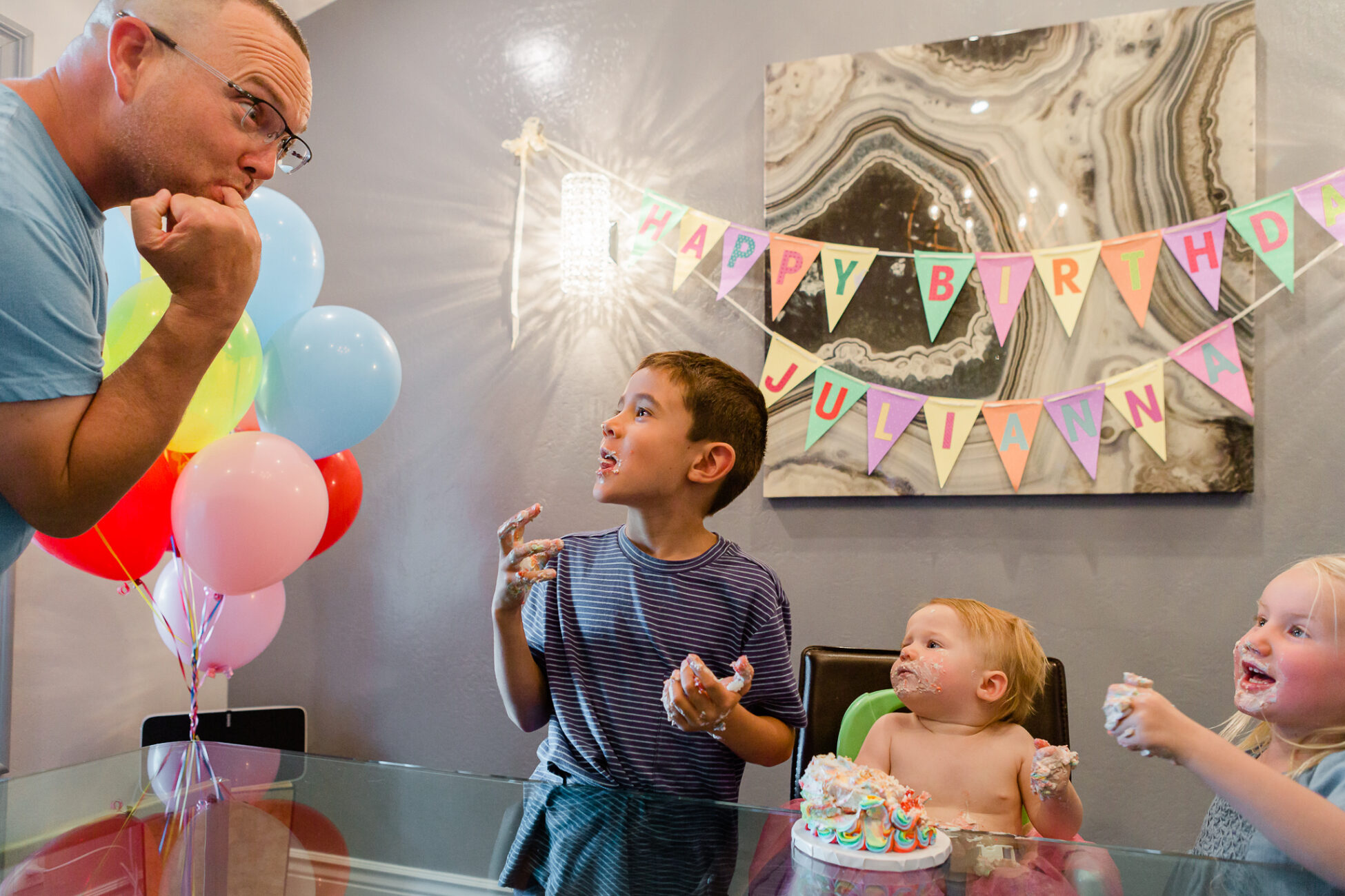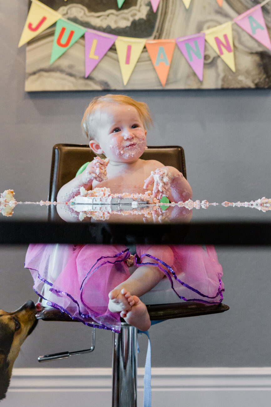 There were so many fun family interactions to capture; one of my favorite moments was crawling under the table where the two sisters were hanging out. The cake smash was a huge hit with the birthday girl and her pet dog (who gladly took the role of vacuum cleaner).